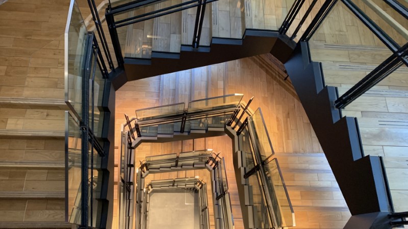 展示スペースを移動するため階段を降ります。ここでもハリーの魔法学校を想起させる景色が。