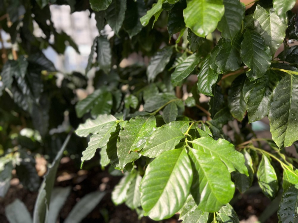 観葉植物たちが活き活きとして見えるここは、さまざまな種類の熱帯果樹を育てている温室。渋谷駅から徒歩数分とは思えない、静かな場所です。
