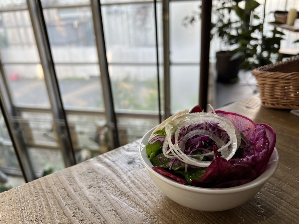 二階のカフェでは有機栽培のサラダがいただけました。水々しくて美味しい…!