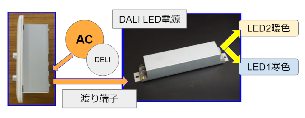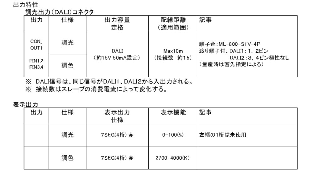 • 出力:最大15台まで弊社DALI 電源(Type-D)接続。簡易に調色/調光可能。絶縁型DALI制御入力、渡り端子付き
